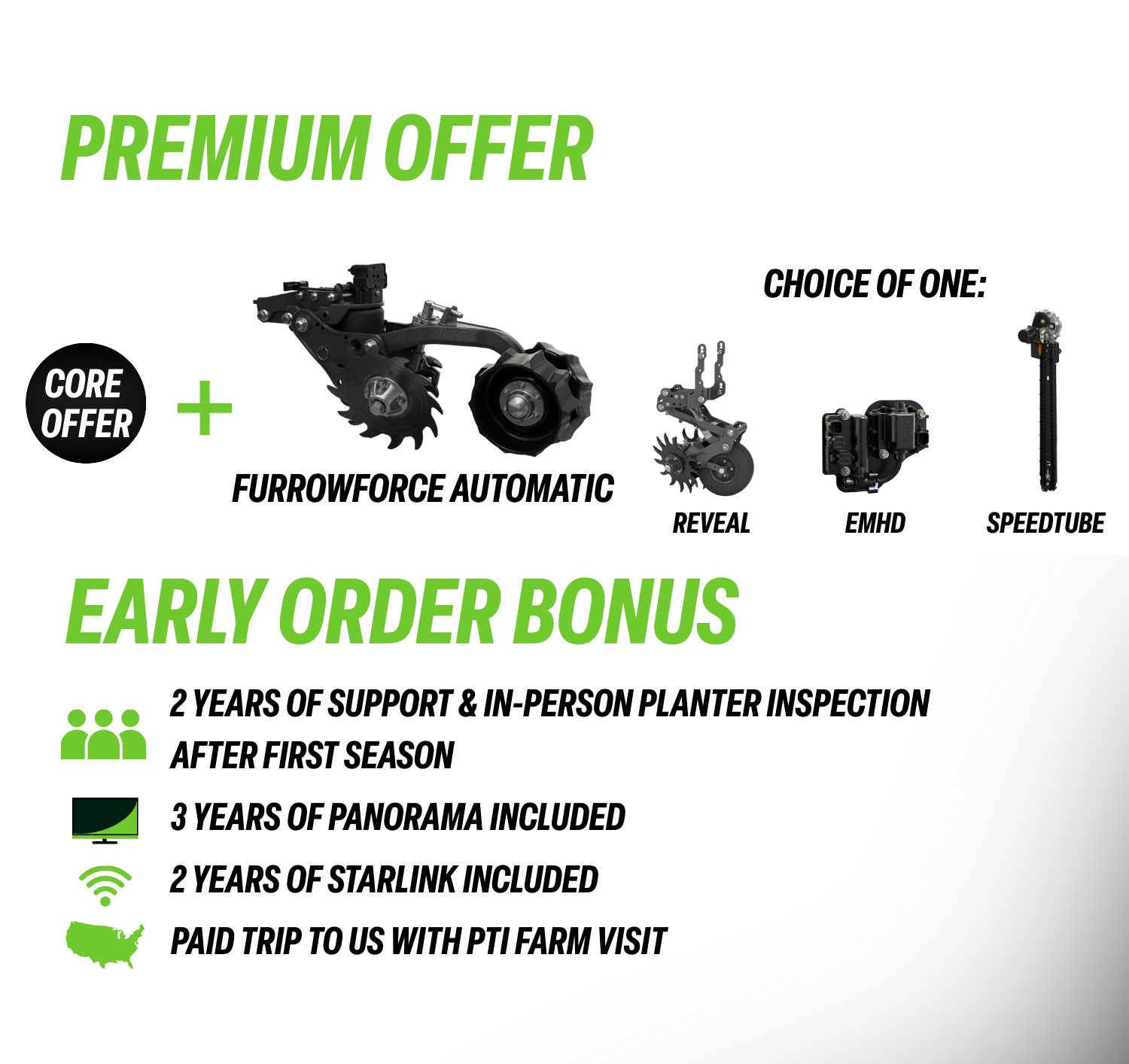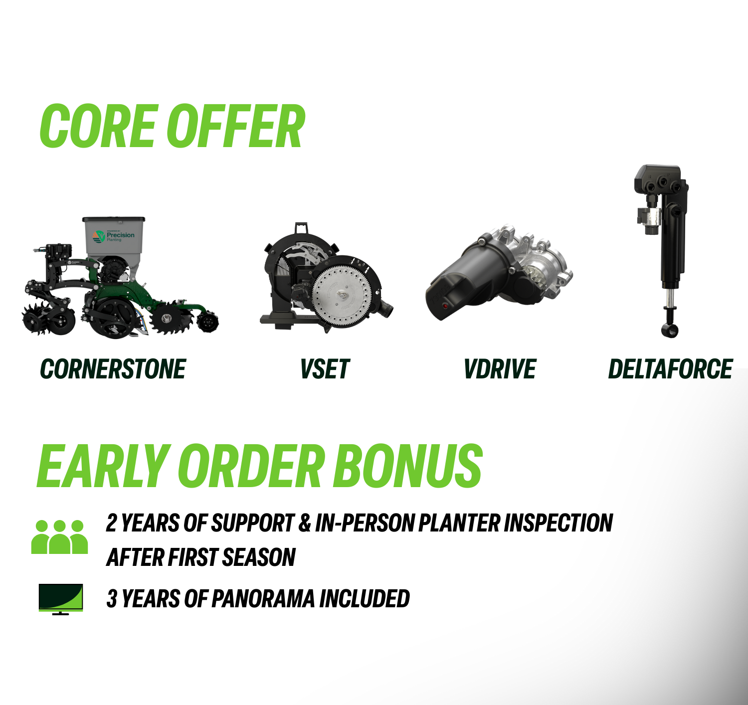 To support growers at different stages of their planting system journey, the early order program also includes two pathways: Core Offer and Premium Offer — both built around CornerStone® row units and Precision Planting technology.